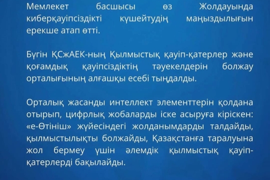 Глава государства в Послании особо отметил необходимость укреплять кибербезопасности.